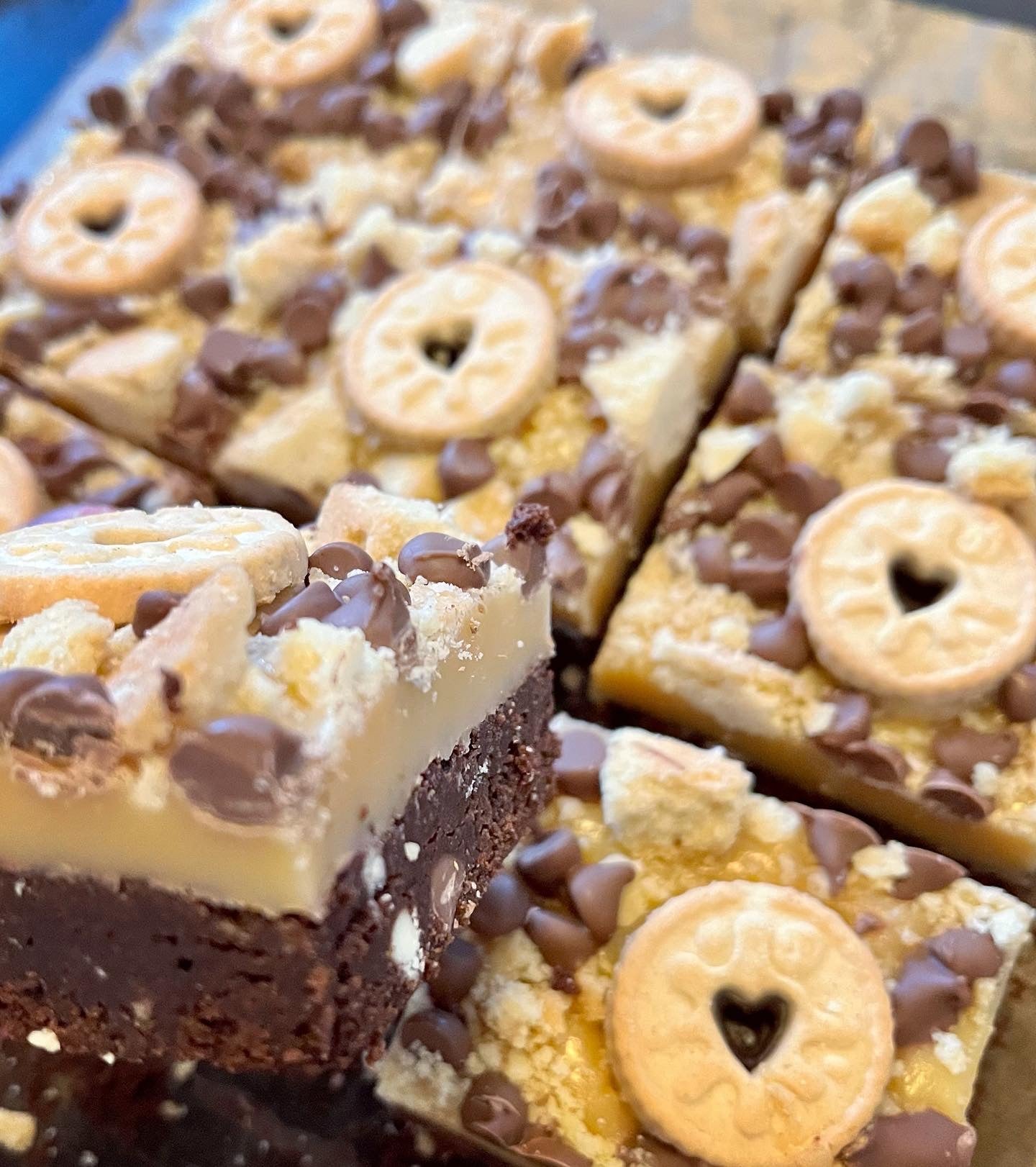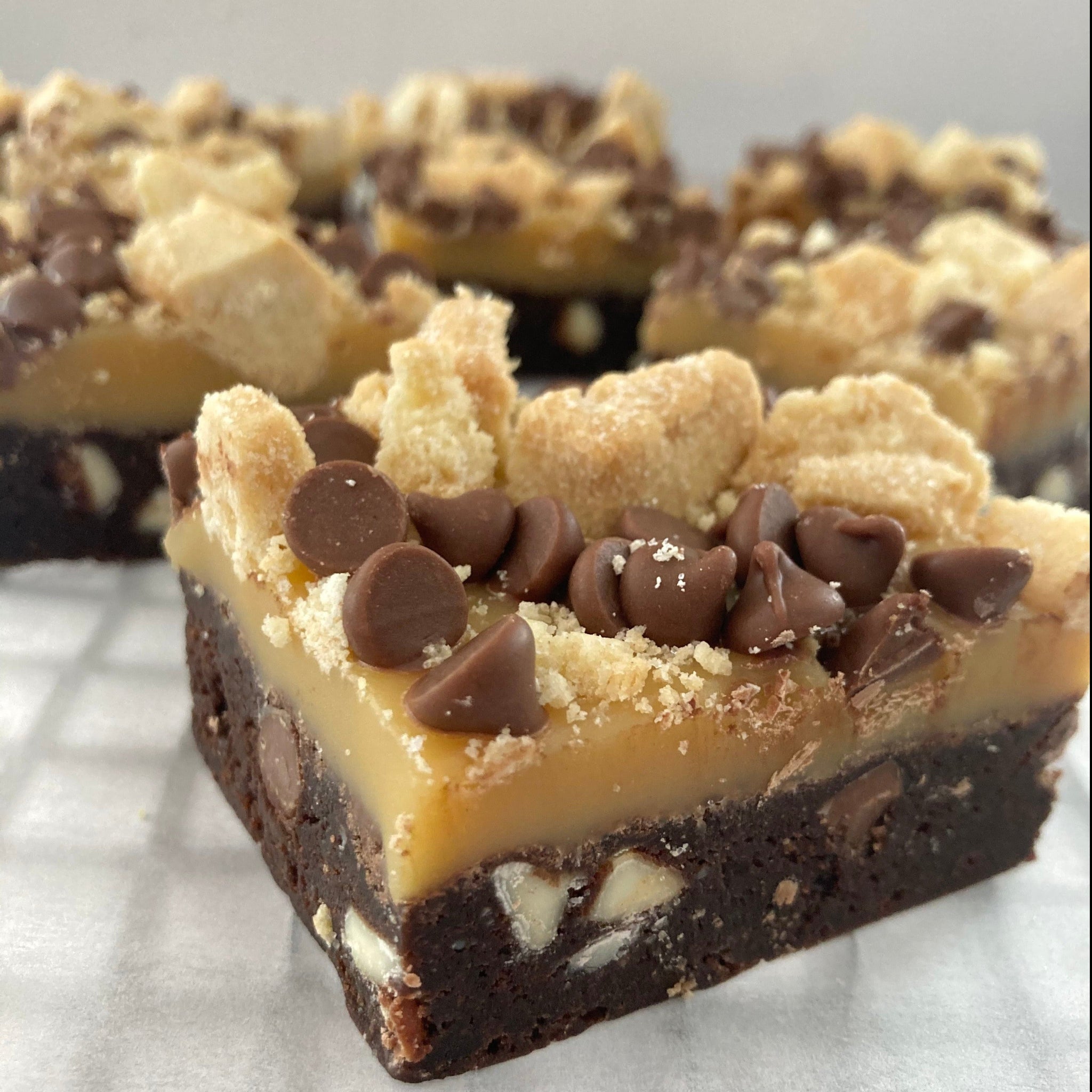 (Our classic fudgy choc chip brownie base, with a thick layer of caramel and topped with choc chips and chunks of shortbread)